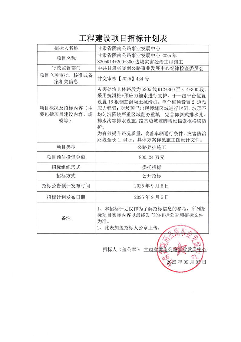 甘肅省隴南公路事業(yè)發(fā)展中心2025年S205K14+200-300邊坡災(zāi)害處治工程施工