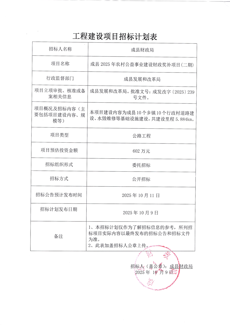 成縣2025年農(nóng)村公益事業(yè)建設財政獎補項目(二期)